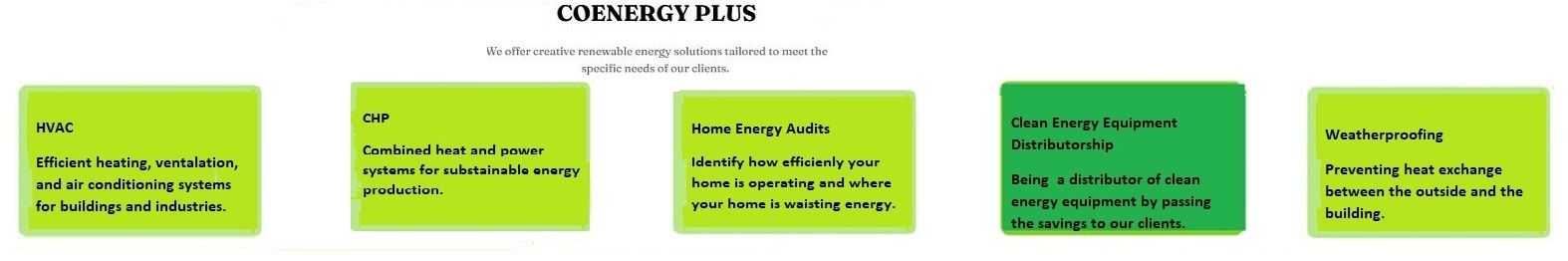 ⦁ At COENERGY PLUS, we specialize in installing HVAC, CHP, and heat pump devices that use renewable energy from sources such as geothermal, solar, and wind.